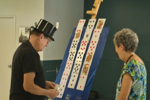 À tout cela, s’ajoutent évidemment un bon repas et de beaux tours de magie qu’André nous a présentés. Parlant de magie, je me permets d’ajouter cette belle référence que vous trouverez sur Internet ; cliquez sur ce lien pour voir le site « Mathémagie » de l’Université Laval. Ce site s’adresse aux enseignants du primaire et du secondaire. Vous y trouverez plusieurs vidéos de tours de magie et vous aurez accès aux secrets de ces derniers. Par exemple, André a présenté une variante d’un tour de magie nommé « ABRACADABRA », un mot de 11 lettres pour identifier la onzième carte. Tout y est, de la vidéo aux explications. Merci à toute l’équipe qui a préparé cette belle rencontre. Jean-Yves Boislard. |